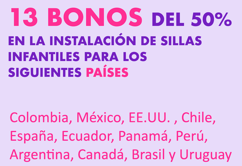 13 bonos del 50% de descuento en la tarifa vigente para la instalación de sillas infantiles. Son 13 bonos para cada país, para un total de 156 bonos. Se entregarán los bonos hasta agotar existencias durante el mes de febrero de 2026. Para recibir el bono, la persona debe realizar el pago del servicio con el 50% de descuento y grabar un video mencionando que está celebrando nuestro cumpleaños y que es uno de los beneficiarios del bono. En el video debe decir desde que país toma el servicio. EL VIDEO SE PUBLICARÁ EN REDES SOCIALES, la persona autoriza la publicación del video. Si lo desea, puede realizar el video sin que se vea su cara.