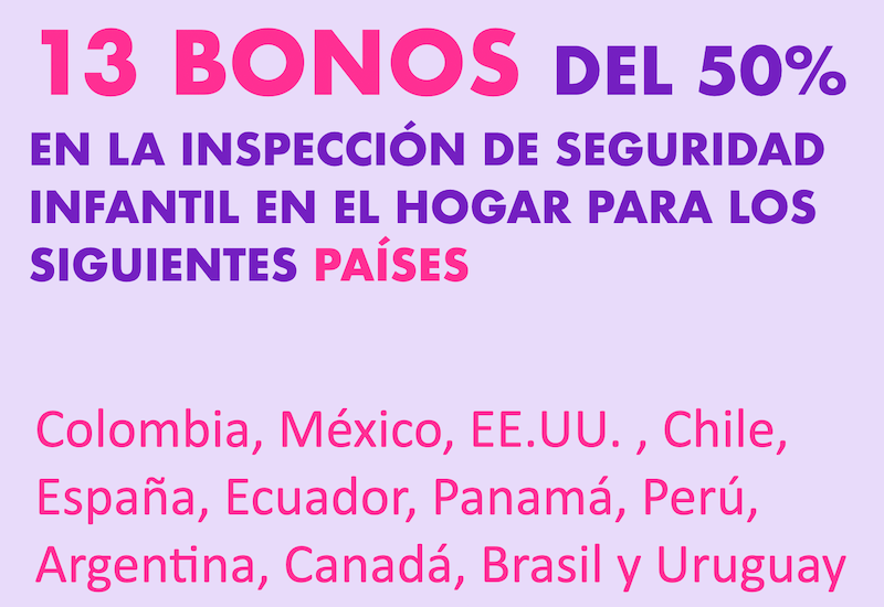 13 bonos del 50% de descuento en la tarifa vigente para la inspección de seguridad infantil en el hogar. Son 13 bonos para cada país, para un total de 156 bonos. Se entregarán los bonos hasta agotar existencias durante el mes de febrero de 2026. Para recibir el bono, la persona debe realizar el pago del servicio con el 50% de descuento y grabar un video mencionando que está celebrando nuestro cumpleaños y que es uno de los beneficiarios del bono. En el video debe decir desde que país toma el servicio. EL VIDEO SE PUBLICARÁ EN REDES SOCIALES, la persona autoriza la publicación del video. Si lo desea, puede realizar el video sin que se vea su cara.