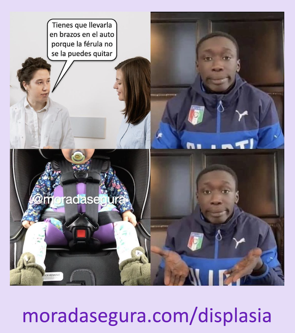 Como creen que no se puede usar la silla infantil cuando un bebé tiene puesta la férula, llevan a los bebés en brazos en el carro. Si los bebés son pequeños, la probabilidad de que quepan en la silla con férula es muy alta. Si ya no caben con la férula, la recomendación es preguntarle al médico por cuánto tiempo permite retirarle la férula teniendo en cuenta que en un carro es más importante usar la silla que la férula por la seguridad en caso de un accidente.