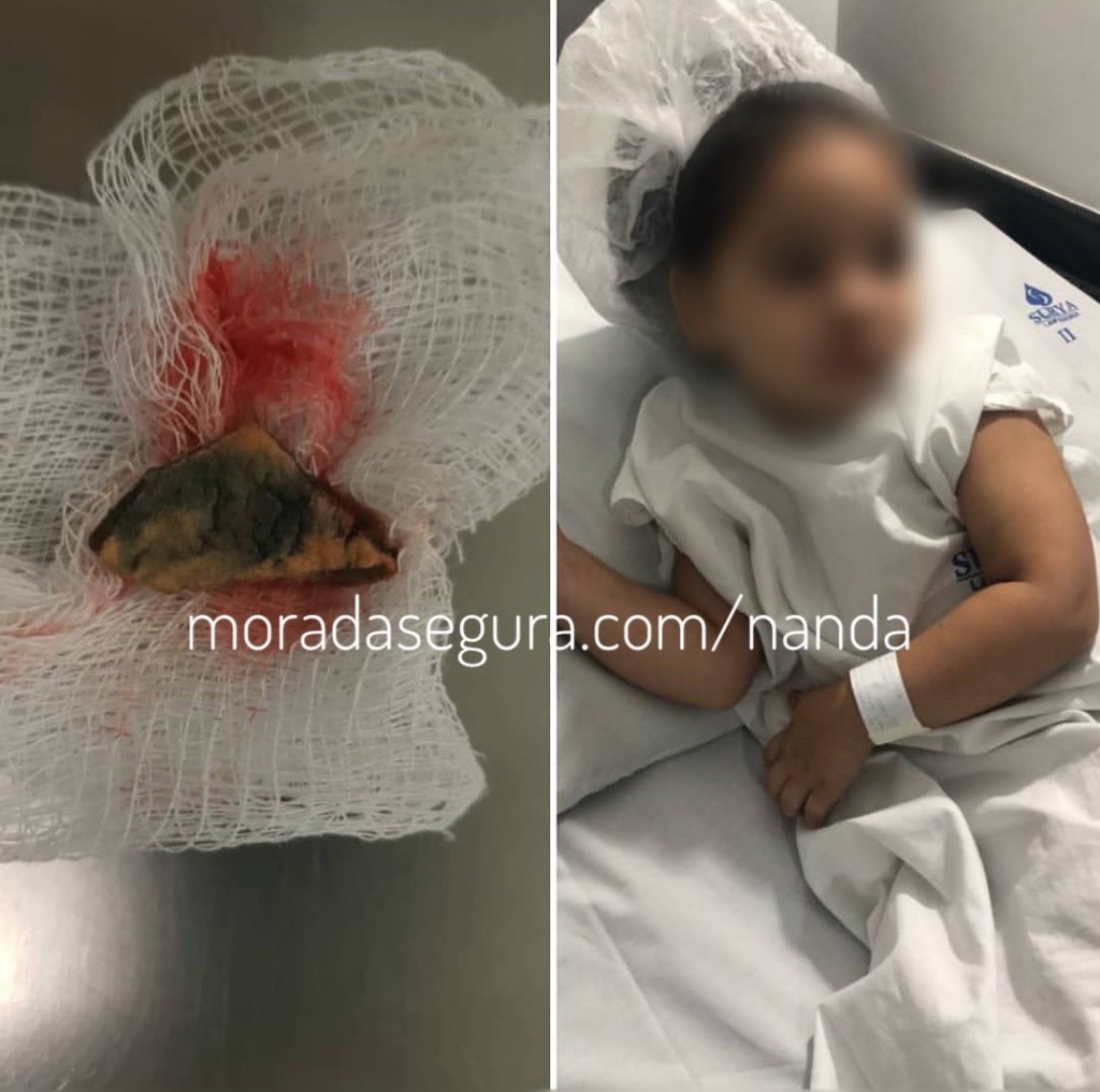 Nanda, de solo 2 años y 7 meses de edad, colocó este objeto en su tracto respiratorio (no me pregunten cómo, porque no sé…) probablemente ocurrió en diciembre / 18, los síntomas fueron gripe, la llevamos al pediatra y dijo que tenía un virus, que solo tomara un antialérgico y se hizo según lo solicitado, pero el mal olor comenzó y solo empeoró … La llevamos al otorrino, donde dijo que tenía un objeto no identificado en una fosa nasal, trató de quitarlo allí mismo, pero no lo logró. Nanda lloró mucho. Entonces, cuando lo intentó de nuevo, pero ella tuvo un ataque de tos y poco después de que ya no encontró el objeto, ordenó Nasonex por 5 días y dijo que, si el mal olor continuaba, regresáramos… Así que lo hicimos, regresamos 8 días después, debido a que el mal olor aún continuaba, luego pasó un RX, pero no se vio nada en ese RX. El médico dijo que tenía inicios de sinusitis, pero como era pequeña, no usó ningún medicamento (pensé que era extraño, pero está bien, el médico era él) … Todo sucedió en Cruz das almas … pero Dios es tan maravilloso que su abuela la llevó a Salvador. Llevó a Nanda a otro otorrino, y desde ese día comenzó la prisa, Nanda tuvo que ser hospitalizada a toda prisa para tener una cirugía de emergencia para extraer el objeto, porque ya estaba podrido llenando toda su cara de pus … El objeto fue identificado como esas alfombras de goma, conocidas como «tatami para niños» y tenía 6 centímetros… es cierto, 6 centímetros.