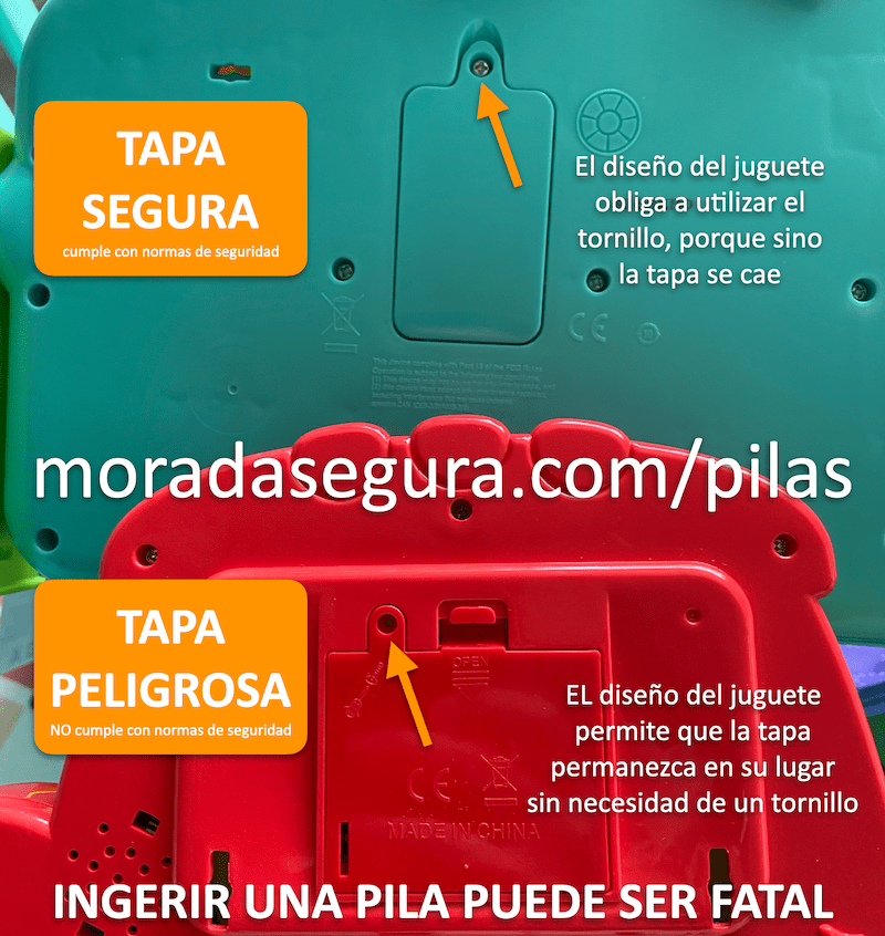 Por un milagro de Dios, ella expulsó la pila en su popó, pero no supimos en que momento la llevó a su boca y se la pasó, nos dimos cuenta cuando encontramos la pila en su popó negro como carbón ese viernes…comenzamos a buscar ayuda de su pediatra tan pronto como vimos sangre roja en su popó y no teníamos ni idea lo grave que era haber dejado entrar a casa juguetes peluches como el del ejemplo, que suenan muy tiernos al oprimir la caja de sonido, pero son mortales, pues son peluches que pueden descoserse como en el caso nuestro y la caja de sonido (donde están las baterías) está inmediatamente al acceso de los niños. Teníamos 3 peluches con sonido y todos venían sin tornillo en la tapa de las pilas; no hay seguridad!!